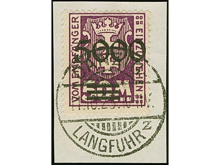 1923, 5000 auf 50 Mark, glänzender Aufdruck, farbfrisch und gut gezähnt, sauber mit zeitgerechtem Stempel “DANZIG-LANGFUHR 11.10.23” auf Briefstück, tadellos, Fotoattest Gruber BPP (2019)