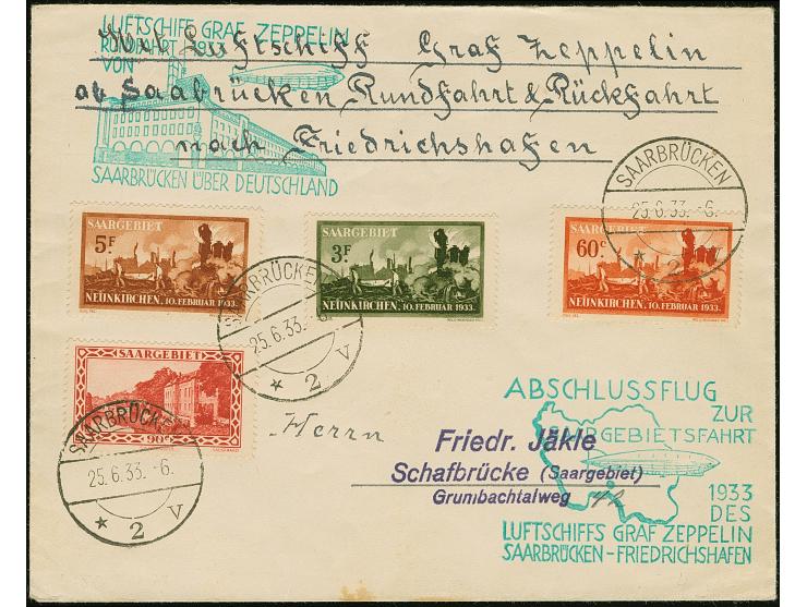 1933, Explosionsunglück Neunkirchen 60 C. – 5 Fr. kpl. mit Zufrankatur auf Zeppelinbrief zur Saargebietsfahrt (Sieger 218 C) von „SAARBRÜCKEN 2 25.6.33“ mit beiden Bestätigungsstempeln via Friedrichshafen nach Basel, einwandfrei, sign. Hoffmann BPP sowie Fotoattest Geigle BPP (2011)