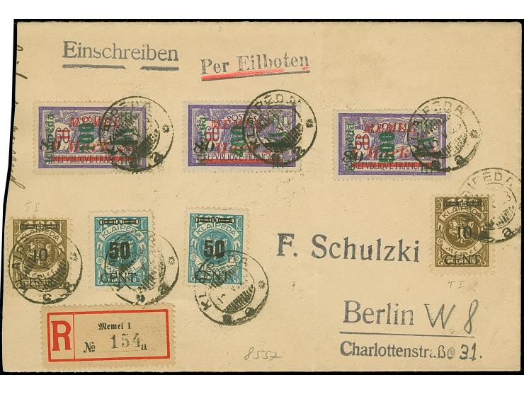 1923, 100-500 Mark auf 80 Mark auf 1,25 Mark, mit Zufrankatur mit Stempel "KLAIPEDA 15.V.23" auf R-Brief nach Berlin, Brief links beschnitten und Marken 1 Wert leicht stockig, auf Brief eine seltene Ausgabe, sign. Ing. Becker und Dr. Petersen BPP