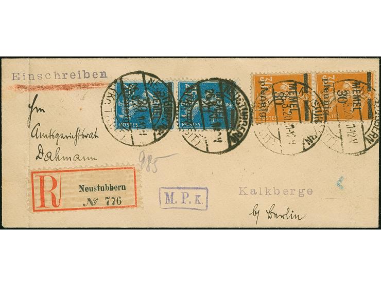 "NEUSTUBBEN (Kr. TILSIT) 26.8.20" mehrfach klar auf zwei senkrechten Paaren 20 pfennig auf 25 Centimes blau sowie 30 pfennig auf 30 Centimes orange, auf R-Brief nach Kalkberge, links gering umgefaltet, sonst tadellos, ein sehr seltener Stempel