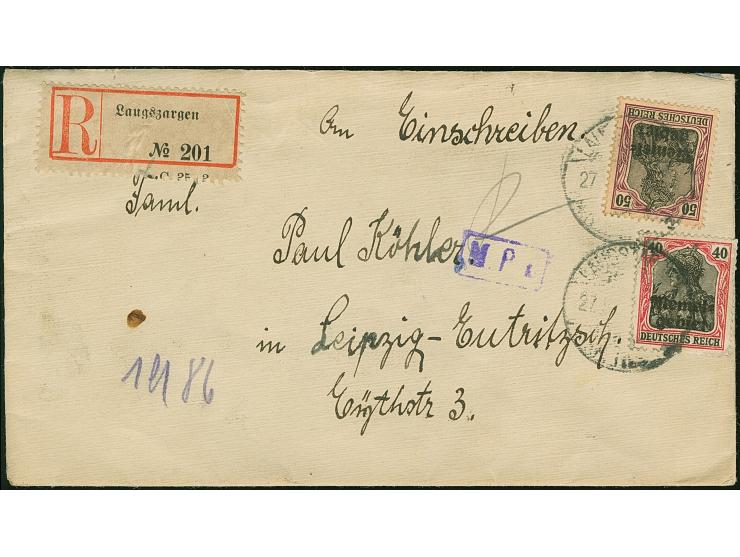 "LAUGSZARGEN * (Kr. TILSIT )* 27.9.20", zweimal typische Abschläge auf Germania 40 und 50 Pfennig auf R-Brief nach Leipzig, die 40 Pfennig durch Randklebung etwas bestoßen, sonst in guter Erhaltung, ein insgesamt schöner Brief mit diesem seltenen Stempel