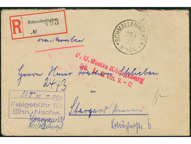 "Freigebühr für Einn. Nachw." violetter Ra3 mit eingesetzem Wert "110" und nebengesetztem Stempel "SCHMALLENINGKEN 27.1.23" auf zensiertem Einschreiben nach Stargard, von Schmalleningken sind Barfrankaturen relativ selten, gute Erhaltung