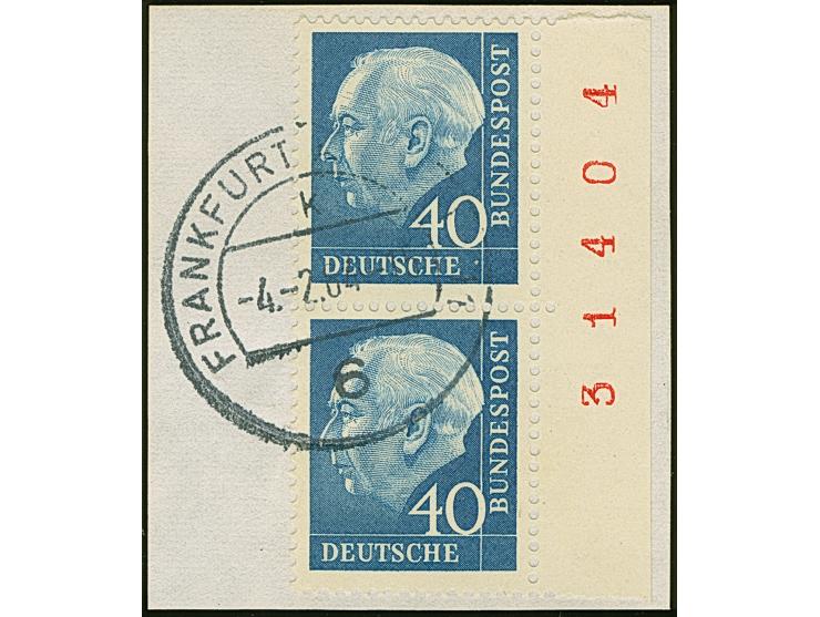 1960, Lumogen 5-40 Pfg., einheitlich in senkrechten Seitenrandpaaren mit roter Bogenlaufnummer, sauber gestempelt “FRANKFURT AM MAIN 4.2.64” auf Briefstücken, der untere 25 Pfg. Wert hat unten zwei verkürzte Zähne, die übrigen tadellos, Fotoattest H.-D. Schlegel BPP