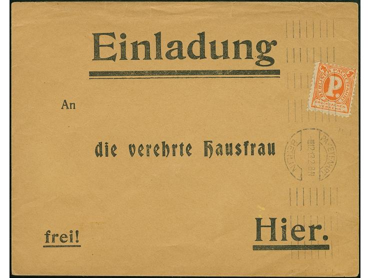 Packetfahrt: 1902/12, “P.”-Marken für den Drucksachenverkehr, sechs Briefe mit u.a. drei Briefen mit Maschinenstempel “PACKETFAHRT BERLIN” und Brief mit Ausgabe 1902 Marke in Rot und violetten L2 “Durch Eilboten zu bestellen”, dazu ungebrauchte Doppeltkarte der Berliner Paketfahrt-Gesellschaft