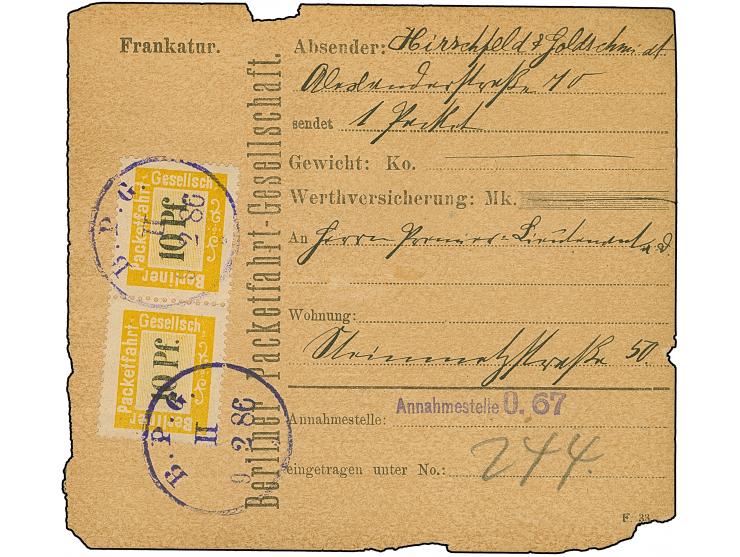 Berliner Packetfahrt Gesellschaft: 1884/86, drei frankierte Paketkarten aus 1886 mit waagerechtem Paar Ausgabe 1884 10 Pfg. gelb als Mehrfachfrankatur, 2. Paketkarte mit waagerechtem Paar Ausgabe 1885/86 15 Pfg. lilabraun und Einzelwert 10 Pfg. gelb und 3. Paketkarte mit zwei Einzelwerten 20 Pfg. rotbraun und Einzelwert 10 Pfg. gelb. Alle drei Paketkarten haben Randfehler, die Marken sind in einwandfreier Erhaltung (Mi.-Nr. ex3-11)