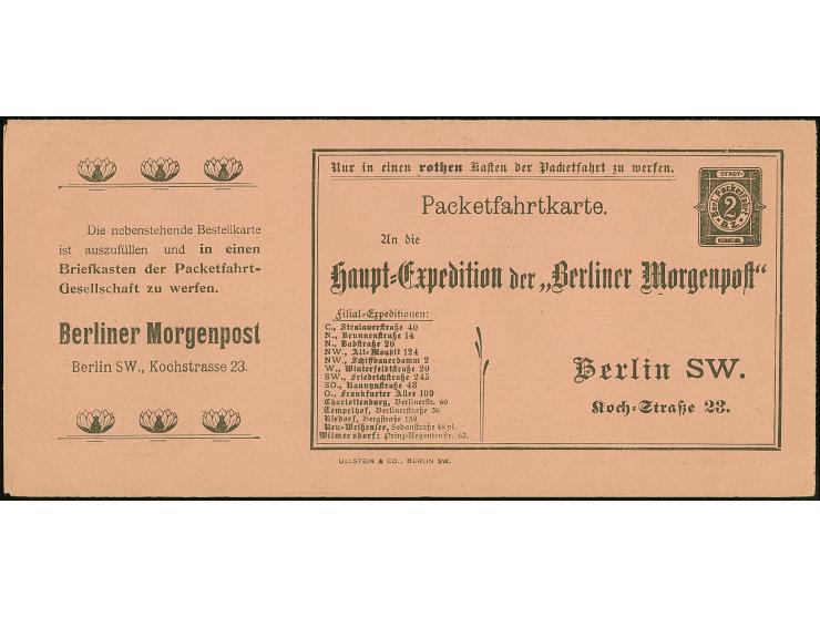Berliner Packetfahrt-Gesellschaft: 1900 (ca.), Ganzsachenkarte auf Privat-Bestellung 2 Pfg. schwarz auf lachsfarben als Teil eines kompletten Werbeblattes der “Berliner Morgenpost” mit u.a. rückseitiger Abbildung einer Zirkus-Landschaft inkl. eines Elefanten. Das Werbeblatt wurde dreiteilig vorgefaltet und ist in einwandfreier Erhaltung. In dieser Form selten