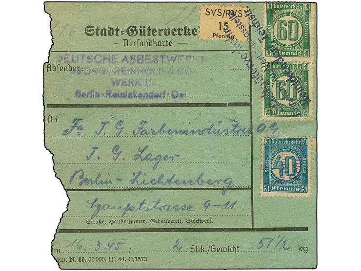 Stadt-Güter-Verkehr Berlin: 1944,60 Pfg. dunkelgrün im senkrechten Paar und 40 Pfg. hellblau sowie Versicherungsmarke 15 Pfg. mit violettem L3 “Stadt-Güterverkehr Annahme und Verteilung Reinickendorf, Teichstr.” auf Paketkarte für 2 Pakete nach Berlin-Lichtenberg, Einlieferung datiert vom 16.3.45. Die Marken sind in einwandfreier Erhaltung, Das Formular mit leichter senkrechter Faltung und links mit kleinen Fehlstellen
