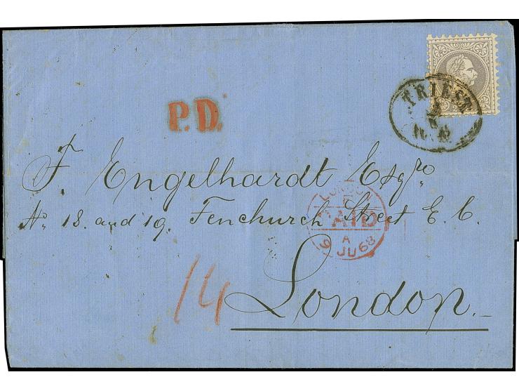 1868, 25 Kr. lila, farbfrisch und gut gezähnt, klar und übergehend entwertet mit Ovalstempel "TRIEST 5 / 6 IV. E." auf vollständigem Faltbrief nach London. Vorderseitig nebengesetzter roter "P.D." und "LONDON F PAID A 9 JU 68". Waagrechter Archivbug abseits der Frankatur. Bemerkung: Das Porto von Österreich nach Grossbritannien betrug insgesamt 25 Kreuzer. Beim Weg über Preussen und Belgien verblieben 11 Kr. bei Österreich, 14 Kreuzer wurden aber wie in diesem Fall als Weiterfranko vermerkt. Beim Transport über Baden und Frankreich verblieben nur acht Kreuzer bei Österreich, während 17 Kreuzer als Weiterfranko abgegeben werden mussten.