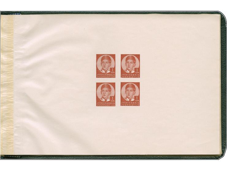 1935, King Peter II. 0,25-1,75 din. and 3-30 din., imperforate proofs in original colours, blocks of 4 on white paper (180x125mm), bound in official book, fine. Probably a unique rarity of this kind