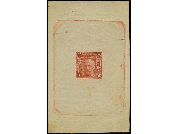1906, Kaiser Franz. Joseph I. 5 Kr. bräunlichrot, ungezähnter Probedruck als Einzelabzug im Blockformat auf Papier ohne Gummierung. Im Rand oben und unten fehlerhaft und mit Bügen, Innenteil in guter Erhaltung