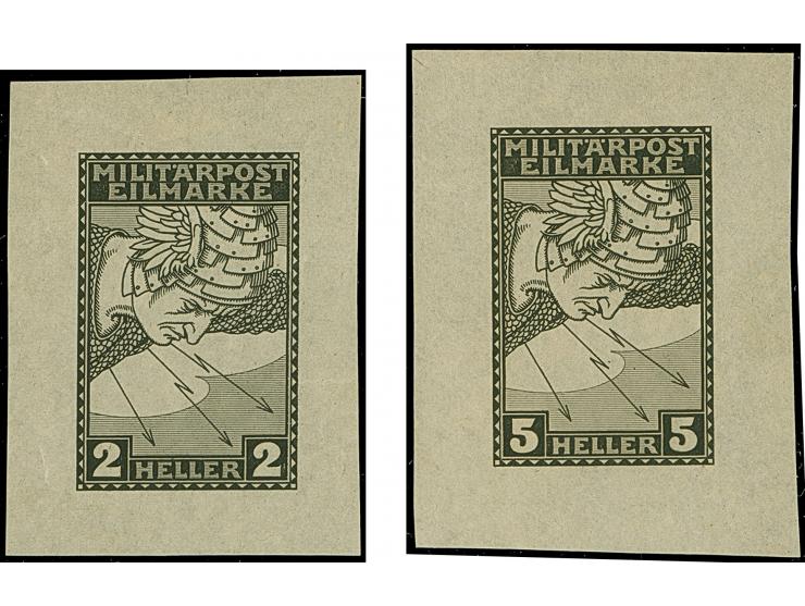 1916, Eilmarken für Drucksachen 2 und 5 H. schwarz, ungezähnte Probedrucke im kleineren Blockformat auf dünnem Papier ohne Gummierung. Beide Probedrucke mit kleinen Knitter- oder Druckspuren, ansonsten in guter Erhaltung