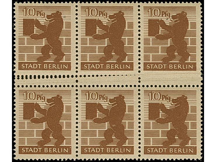 Berliner Bär 10 Pfg. im waagerechten 6er-Block, durch Druckfalte links mit 2 senkrechten Zwischensteg-Paaren, postfrisch. Ein interessante Abart.
