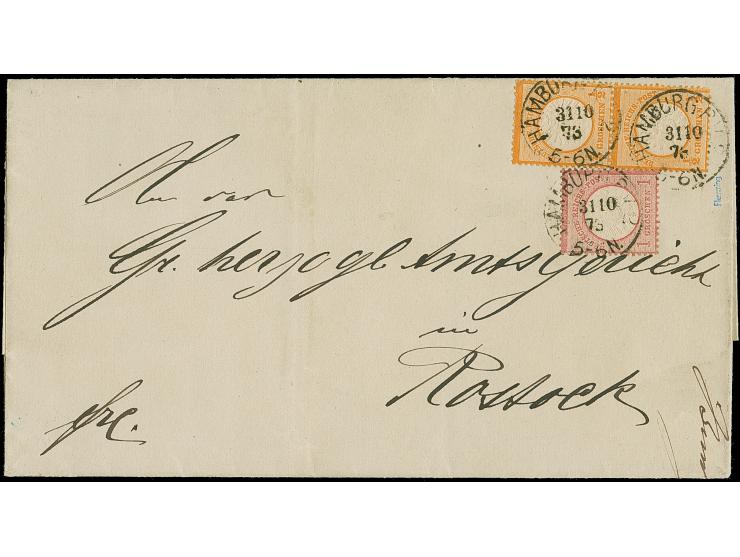 ½ Gr. orange mit Plattenfehler “Farbstrich auf der 10. Strichleiste rechts” (Feld 49) im senkrechten Paar mit Normalmarke und Einzelwert 1 Gr. karmin je mit EKr. “HAMBURG P.V.2 31.10.73" als tarifgerechte Frankatur auf Faltbriefhülle der 2. Gewichtsstufe nach Rostock. Die farbfrischen Marken sind gut geprägt, gut gezähnt und bis auf eine kleine Druckstelle bei der unteren ½ Gr.-Marke in einwandfreier Erhaltung. Eine dekorative und nicht häufige Frankatur-Kombination mit Plattenfehler, sign. Flemming und Fotoattest Sommer BPP (2006)