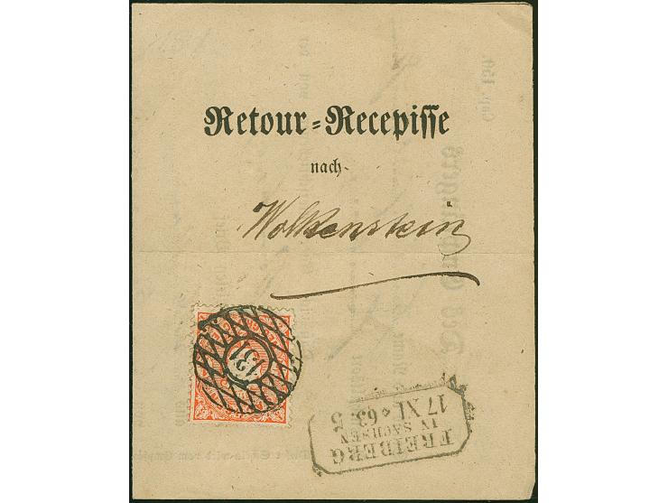 ½ Ngr. orange, farbfrisch und gut gezähnt, mit klar aufgesetztem Nr "131" und nebengesetztem Ra3 "FREIBERG IN SACHSEN 17 XI 63" auf Retour-Recepisse nach Wolkenstein. Ein seltenes frankiertes Formular in sehr schöner Erhaltung.