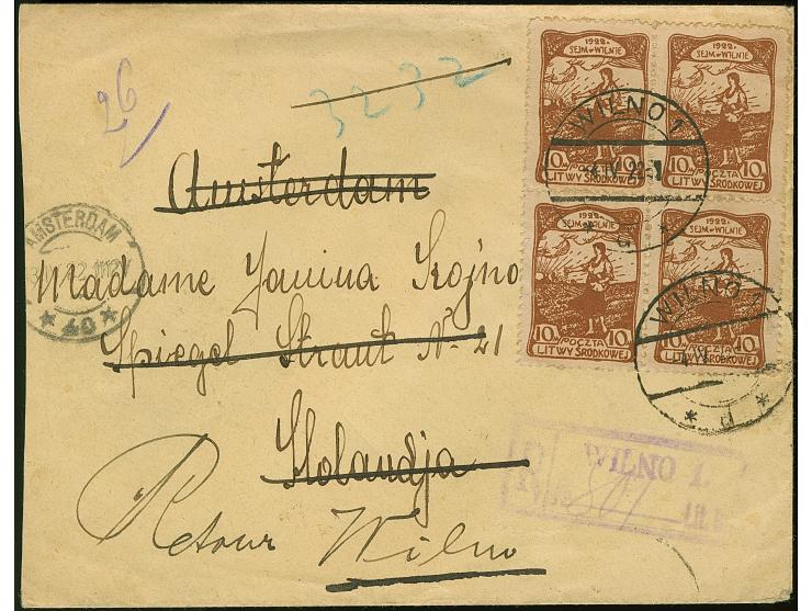 1922, Opening of the state parliament Sejm 10 marka, block of four, with additional franking, tied by cds. “WILNO -4.IV.22” to front and reverse of registered cover to Amsterdam with arrival mark “AMSTERDAM 13.IV.22”, there undeliverable with handwritten note on reverse “…inconnu..”, thus returned with arrival mark “WILNO 19.IV.22”. One stamp of the block of four small tear, otherwise fine, a scarce and attractive entire with the corresponding registration slip