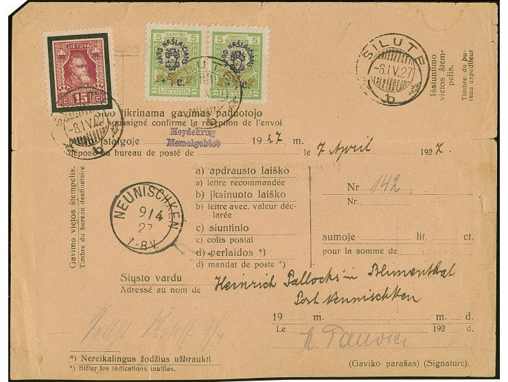 1926, War orphans + 2 on 5 centu green, horizontal pair together with Basanavicius 15 centu, tied by cds. "SILUTE -8.IV.27" to "Avis de reception" to Neunischken with arrival mark, few tears and wrinkles, but interesting usage