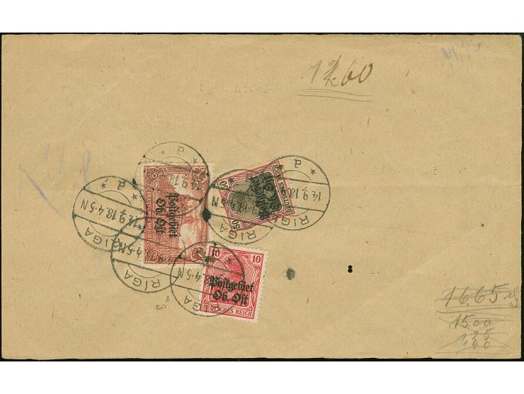 1916, Germania 1 Mark rot mit Zufrankatur mit Stempel “RIGA 14.9.18” rückseitig auf provisorischem Formular für ein Telegramm nach Pirna, mit Zensur-EKr. “R” sowie Stempel des Stadthauptmanns “Der Stadthauptmann i.V. Leutnant d.R. Polizeirichter”, seltene Verwendung, die 1 Mark etwas sulfidiert, sonst gute Erhaltung