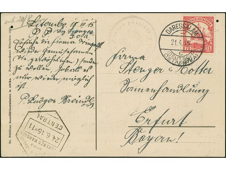 1915, “DARESSALMA (DOA) c 21.3.15” klar auf Kaiseryacht 7½ H. mit Wasserzeichen auf Ansichtskarte mit Text und Datierung “Litembo 18.III.15” und violettem Zensurstempel “Zensur passiert DOA” via Lourenco Marques nach Erfurt, in guter Erhaltung
