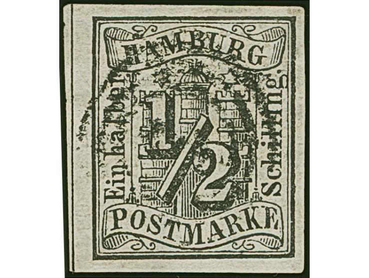½ Sch. schwarz, farbfrisch und allseits breitrandig geschnitten, sauber entwertet durch dänischen Ringstempel "2". Winzig hell, sonst tadellos. Mit dieser Entwertung sehr selten, sign. Grobe sowie Fotoattest Huylmans BPP (2026)