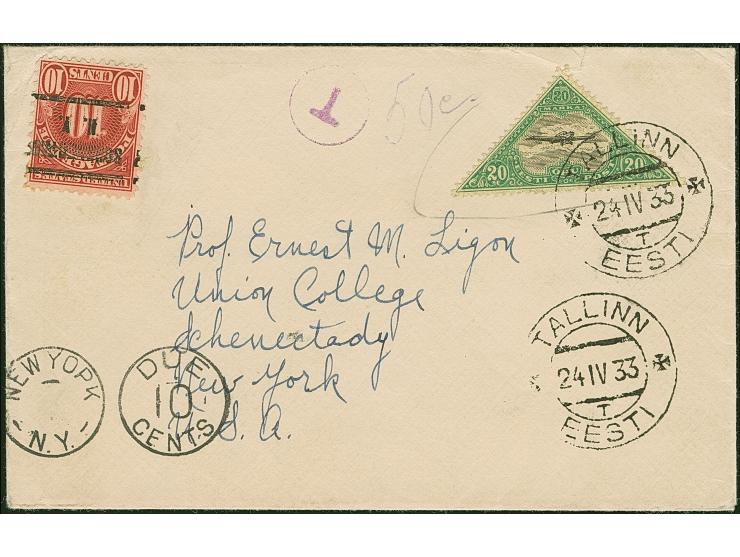 1924, Airmail 20 marka, tied by cds. "TALLINN 24 IV 33" to cover to New York, as airmail stamps were only valid for airmail fees. The cover was handled as unfranked and charged with a 50 c. surcharge fee; at arrival, franked with USA postage due 10 c., fine and scarce, certificate Löbbering BPP (2015)