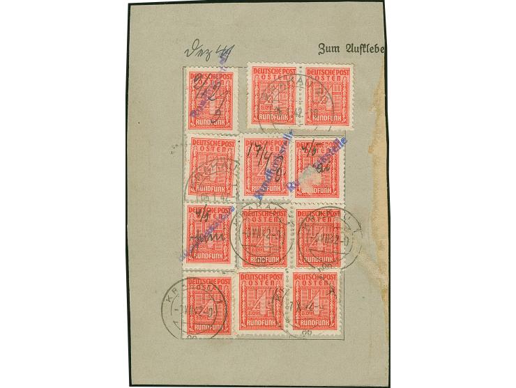 1940, 4 Zloty orangerot, 12 Werte mit verschiedenen Entwertungen auf Rundfunkgenehmigungskartenteil für ein Kaufgerät, datiert “Krakau 2.12.1941” mit grünem Dienstsiegel, leichte Gebrauchsspuren, selten
