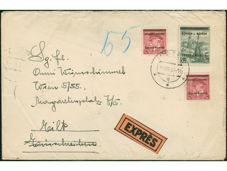 1939, Landschaften 5 Kronen mit Zufrankatur mit Stempel “MISTEK 19.VII.39” auf Express-Brief nach Wien, rückseitig Devisenzensur und Ankunftsstempel, Beförderungsspuren, sonst in guter Erhaltung