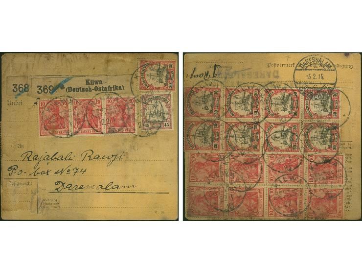 Kreuzer Königsberg: Germania 10 Pfg., 11 Stück, teils in Einheiten, vorder- und rückseitig, zusammen mit Schiffsausgabe 30 H. (9) und 45 H. mit sauberen Stempeln "KILWA 22 I 16" auf Paketkarte nach Daressalam, mit Ankunftsstempel vom 5. Februar. Die Karte zeigt leichte Lagerungsspuren mit teilweiser Tönung, wenige Werte durch Randklebung leichte Zähnungs- bzw. Randfehler. Eine große Kolonial-Seltenheit.