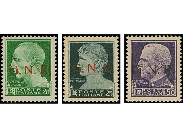1943, 5 c. -1 l., 1,75-50 l. and airmail 25 c.-5 l. with overprint “G.N.R.”, 26 different stamps, mint never hinged, verfy fine, a.o. sign. Colla with two certificate (2025) for Verona or Brescia prints