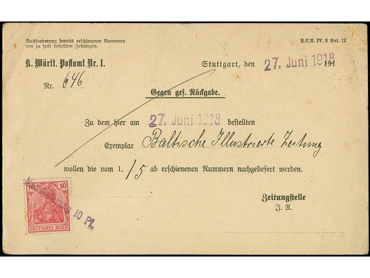 Deutsches Reich Germania 10 Pfennig. lebhaftrotkarmin, mit violettem L1 „Nachlieferung 10 Pfg.“ rückseitig auf Zeitungssache für ein Exemplar „Baltische Illustrierte Teitung“ von „STUTTGART 9.7.18“ nach Riga, Ober Ost, Formular mit Beförderungsspuren im Rand, selten, Fotobefund Jäschke-L. BPP (2015)