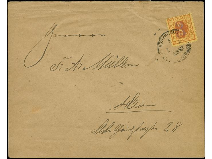 Transport-Anstalt und Privat-Post: 1887, 3 auf 2 Pfg. hellbraun auf gelb mit Stempel “PRIVAT-STADTPOST WIESBADEN 5.7.1887” auf Ortsbrief. Der Umschlag mit stärkeren Randspuren oben und leichte waagerechte Faltung unten, ansonsten in guter Erhaltung