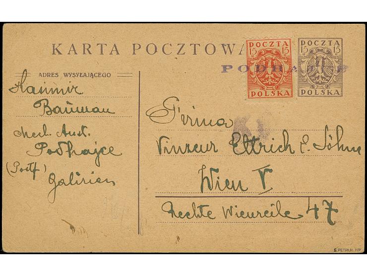 “PODHAJCE”, violet straight-line on postal stationery card 15 f. with additional franking to Vienna with Krakow censorship alongside, fine, signed Petriuk