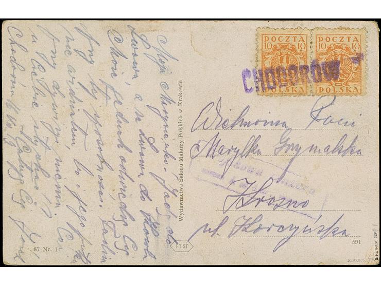 “CHODOROW”, violet straight-line Coat of arms 10 f. horizontal pair on postcard to Krosno with Lviv censorship alongside, fine, signed Petriuk