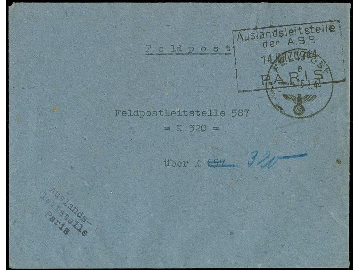 1944, “Auslandsleitstelle der A.B.P. PARIS 14.MRZ.1944”, schwarzer Rahmenstempel klar auf Feldpostbrief mit Normstempel “e 15.3.44” an die Feldpostleitstelle 587, in guter Erhaltung