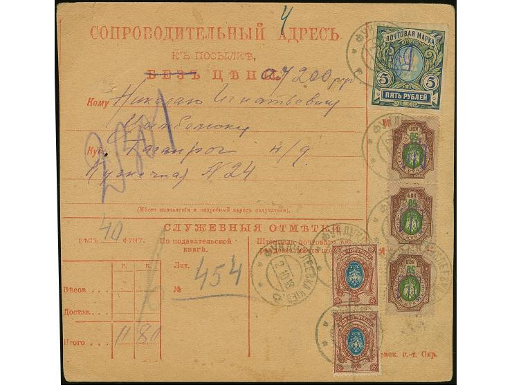 1918, Parcel card for a sending to Taganrog weighting 40 funts (about 16 kg), endorsed “11 (roubles) 80 (kopeks)" and accordingly franked with Kiev Tridents 5 r. and 50 k. (block of ten and strip of three) in mixed franking with Russia 15 k. (vertical pair), all tied by cds “FUNDUKLEEV KIEV 2 10 18”, reverse ”TAGANROG 22 9 23"; fine and very scarce