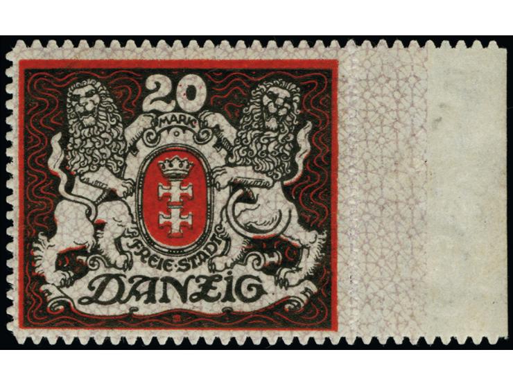1921, Großes Staatswappen 20 M., Probedrucke auf Papier mit stehendem Wasserzeichen und violettem Rosettenunterdruck, reches Seitenrandstück, sauber ungebraucht, eine sehr seltene Marke, nach unseren Unterlagen nur 2 Bogen (50 Stück) gedruckt, tadellos, Fotoattest Bock BPP (2025)