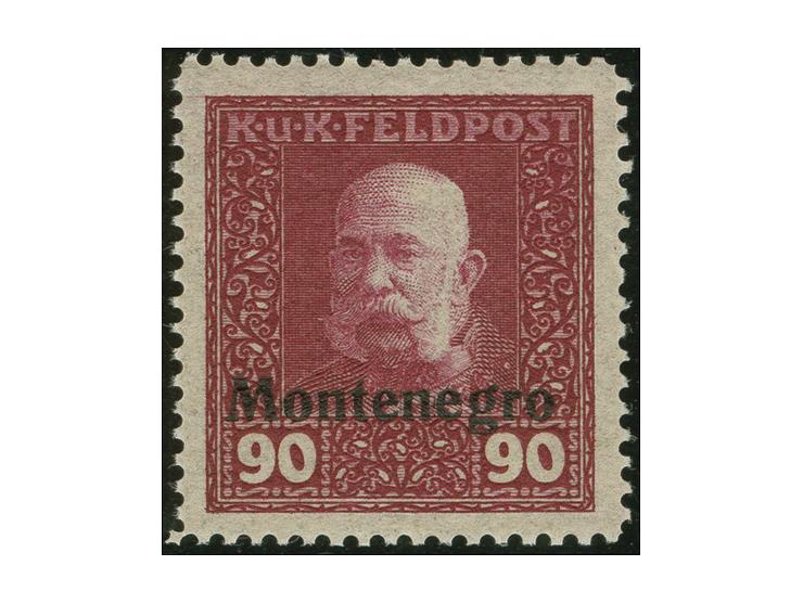 1918, nicht ausgegebene Werte mit waagerechtem schwarzen Aufdruck "Montenegro": 3 Heller im waagerechten Paar und 5 Heller-90 Heller (ohne so nicht existierende 35 Heller), 2 Werte ungebraucht, sonst postfrisch; 45 Heller signiert Ferchenbauer