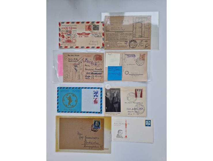 1949/90, umfangreicher Sammlungsbestand mit ca. 350 Briefen, Karten und Ganzsachen mit vielen besseren Frankaturen, sehr vielen Übersee-Luftpostbriefen, Portostufen und weiteren Besonderheiten. Dabei u.a. Mi.-Nr. 38+40 auf IAS-Luftpostbrief in die USA, Mi.-Nr. 53 auf Luftpost-Drucksache in die USA, Mi.-Nr. 58, 54 und 47 auf R-Luftpostbrief in die USA. 2x Mi.-Nr. 85 auf Luftpostbrief, Mi.-Nr. 152 auf Luftpost-Drucksache im Großformat, Mi.-Nr. 153 auf Luftpost-Drucksache im Großformat und EF Mi.-Nr. 154 auf R-Luftpostbrief in die USA. Die Erhaltung ist zum Teil fehlerhaft bzw. in Bedarfserhaltung