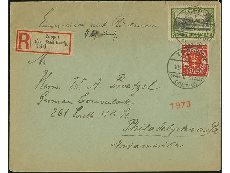 1924, Ansichten 1 G. mit Plattenfehler “gebogener senkrechter Strich im ”O" und abweichendes “i” und Zufrankatur Wappen 20 Pfg., auf portogerechtem R-Rückschein Auslandsbrief nach Philadelphia, USA, nicht häufig, Bedarfserhaltung
