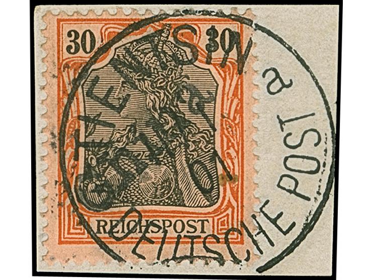 1900, Handstempel 30 Pfg., farbfrisch und gut gezähnt, sauber mit Stempel “TIENTSIN 11/1 01” auf Briefstück, tadellos, ein sehr schönes Exemplar dieser seltenen Marke, sign. G(eorg).F(ulpius) mit Fotoattest (1947) und Fotoattest Jäschke-L. BPP (2019)