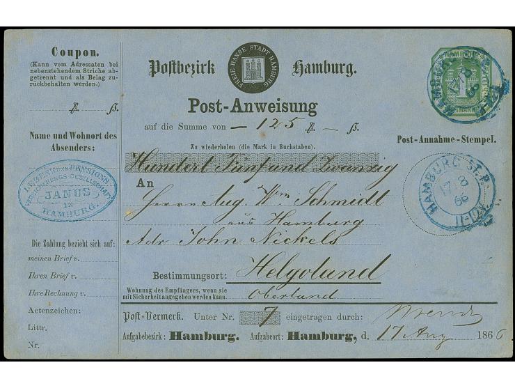 1866, Postanweisung 4 Sch. grün, mit nebengesetztem blauen Aufgabestempel "HAMBURG ST.P. 17.8.66" nach Helgoland mit Auszahlungsvermerk und Ankunftsstempel vom 19.8. Minimal fleckig, sonst sehr schöne frische Erhaltung. Es sind nur wenige Postanweisungen nach Helgoland bekannt