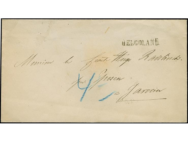 1853, "HELGOLAND." klarer Abschlag des Hamburger L1 auf Briefkuvert via Hamburg mit mit preußischem DKr. “HAMBURG 28/8 65” nach Jarocin, Posen, rückseitig mit Ausgabestempel, ausxtaxiert mit “4½” (Silbergroschen), ein attraktiver Brief, Fotoattest Müller (2008)