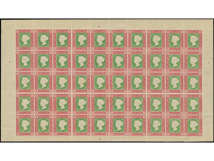 2 Sch.  lilakarmin/dunkelgelblichgrün, kompletter Bogen zu 50 Marken mit allen Rändern, Feld 1 mit Plattenfehler "Linke obere Wertziffer verkürzt....", teils gering angetrennt, postfrisch bzw. kleine Falze im Rand, tadellos
