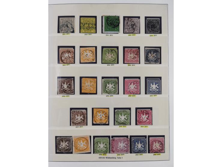 1851/1920, meist gestempelte Sammlung, dabei u.a. elf 18 Kreuzer Werte, teils mit seltenen Plattenfehlern, dabei u.a. Mi.-Nr. 5 gestempelt, 15 ohne Gummi, 8a PF II, 34 PF III, je gestempelt, 42a breitrandig mit handschriftl. Entwertung von Cannstatt, 42b sehr breitrandig mit blauem Fächer-Stempel, 50, 54 postfrisch, etc., Pfennig Teil oft sign. Infla Berlin, teils signiert bzw. 17 Kurz-/Befunde oder Fotoatteste BPP, teils fehlerhaft, meist aber gute Erhaltung