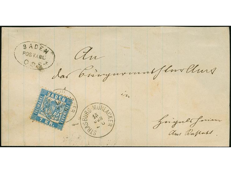 "STRASBURG-MÜHLACKER 15 JUN Z6", EKr. sauber auf- und nebengesetzt auf 1868, 7 Kr. blau, auf Briefvorderseite mit anhängender unterer Klappe, mit nebengesetztem "BADEN POSTABL: OOS" nach Rastatt. Als Entwerteter außerordentlich selten, auf dieser Wertstufe hat PROFI kein weiteres Stück registriert. Kurzbefund Stegmüller BPP