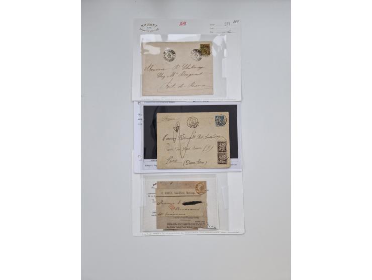 1812/1936, 58 covers and cards, some better frankings and usages throughout, noted a fine section of French Colonies and maritime mail along with better destinations with Texas, British PO in Smyrna, 1874 envelopes (x2) from Hong Kong to New York with 8 c. single frankings with barred oval “B62”, also groups of Dutch East Indies, Gambia, St Helena, etc.,  1812 entire with straightline “Capitainerie de Stupinis” to Linovo, etc., slightly mixed condition