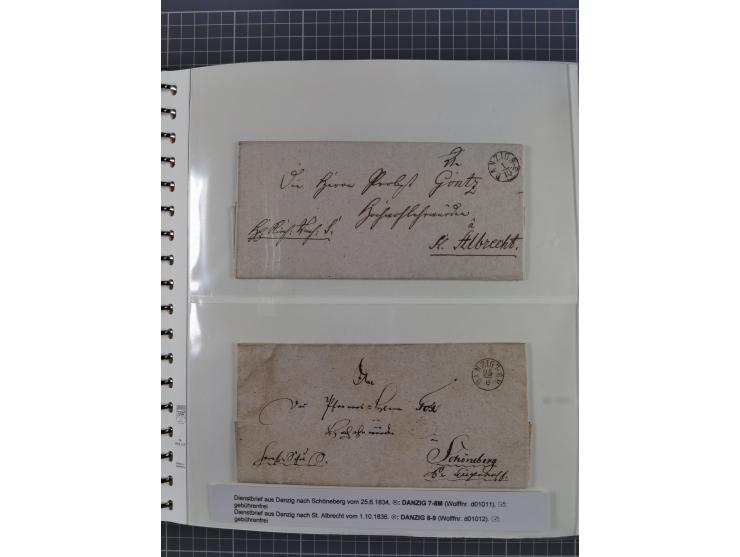 1672/1867, interessante Sammlung “Botenpost und Stempel aus der Preußen-Zeit” mit ca. 120 Briefen und Ganzsachen, dabei u.a. Faltbrief 1672 mit Katierungsvermerken nach Amsterdam, zwei Forwardedbriefe 1732 und 1743 nach Florenz, Franco-Brief mit L2 “DANZIG 19.MRZ.” nach St. Petersburg, “Entlastet Danzig” auf Retour-Brief 1860, bessere EKr.-Stempel nach Wolff-Handbuch, einige Postscheine, frankierte Briefe u.a. nach Amsterdam, Franco-Stempel und weiteren Besonderheiten, zum Teil etwas fehlerhafte, meist in guter Erhaltung, ex Hulkenberg