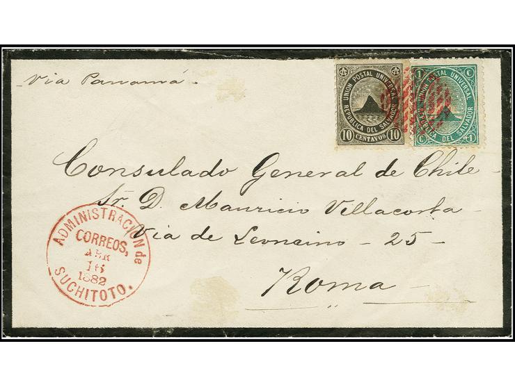 1879, Coat of arms 1c. green and 10c. black tied by wonderfully contrasting red grid of diamonds to mourning cover endorsed "via Panama" to Roma with red cds. "ADMINISTRACION de SUCHITOTO. ABR 16 1882" alongside, a small, completely irrelevant tear at the bottom of 1c. adhesive does not disturb the excellent appearance of this scarce entire
