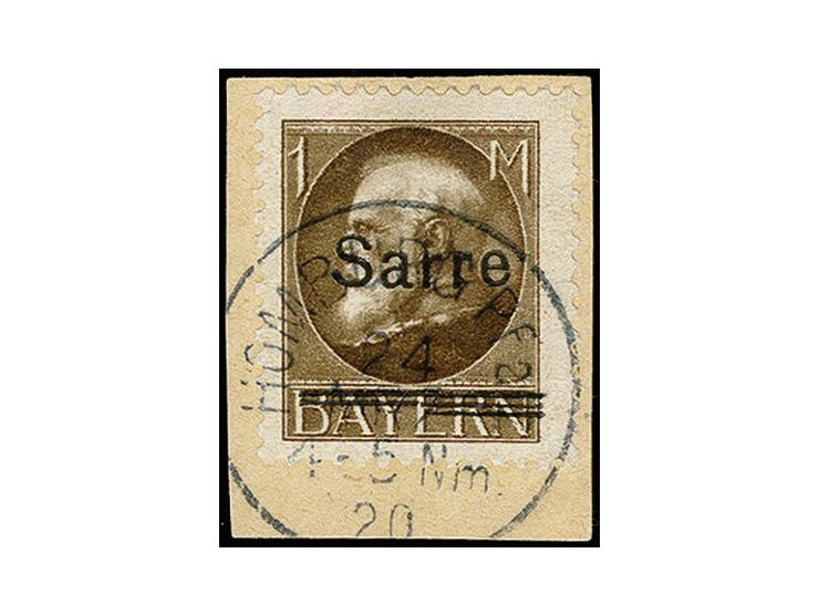 1 M. braun mit Aufdruckabart „2 ½ statt 5 Gitterlinien über BAYERN“ (Feld 22), sauber mit Stempel „HOMBURG 24.MRZ.20“ auf Briefstück, tadellos, doppelt sign. Burger BPP mit Fotoattest (1981) (Mi. 800,-)
