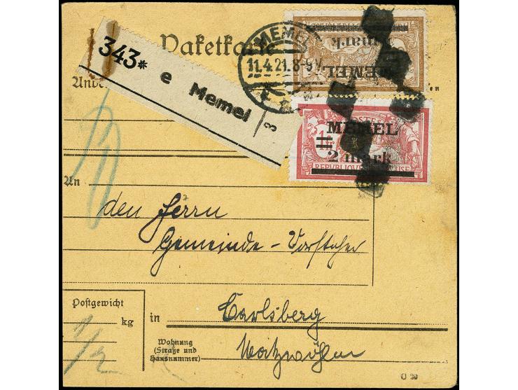 1m. auf 50C. und 2m. auf 1 Fr. sauber mit Päcken- bzw. Tagesstempel "MEMEL 11.4.21" auf Paketkarte nach Carlsberg mit Ankunftsstempel "MATZWÖHLEN 11.4.21", oben links kleine Roststpur, rechts kleiner Einriss, sonst tadellos