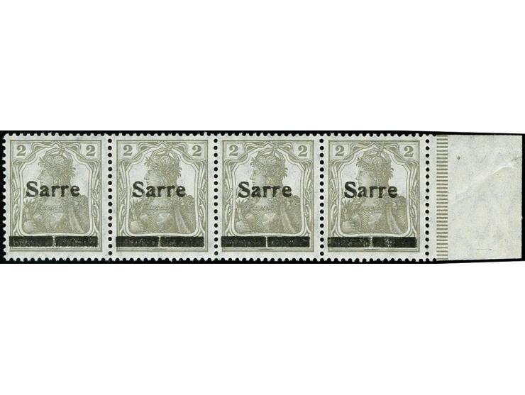 2 Pfg. im waagerechten Viererstreifen, die linke und rechte Marke mit Aufdruckfehler "senkrecht geteilter Balken", die mittleren Marken mit Aufdruckfehler "senkrecht geteilter Balken" sowie "keilförmige Einkerbungen im S", postfrisch bzw. die rechte Marke ungebraucht, der rechte Seitenrand angesetzt, teils etwas stärker vorgefaltet, tadellos, eine seltene und dekorative Einheit, u.a. sign. Burger BPP